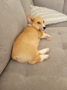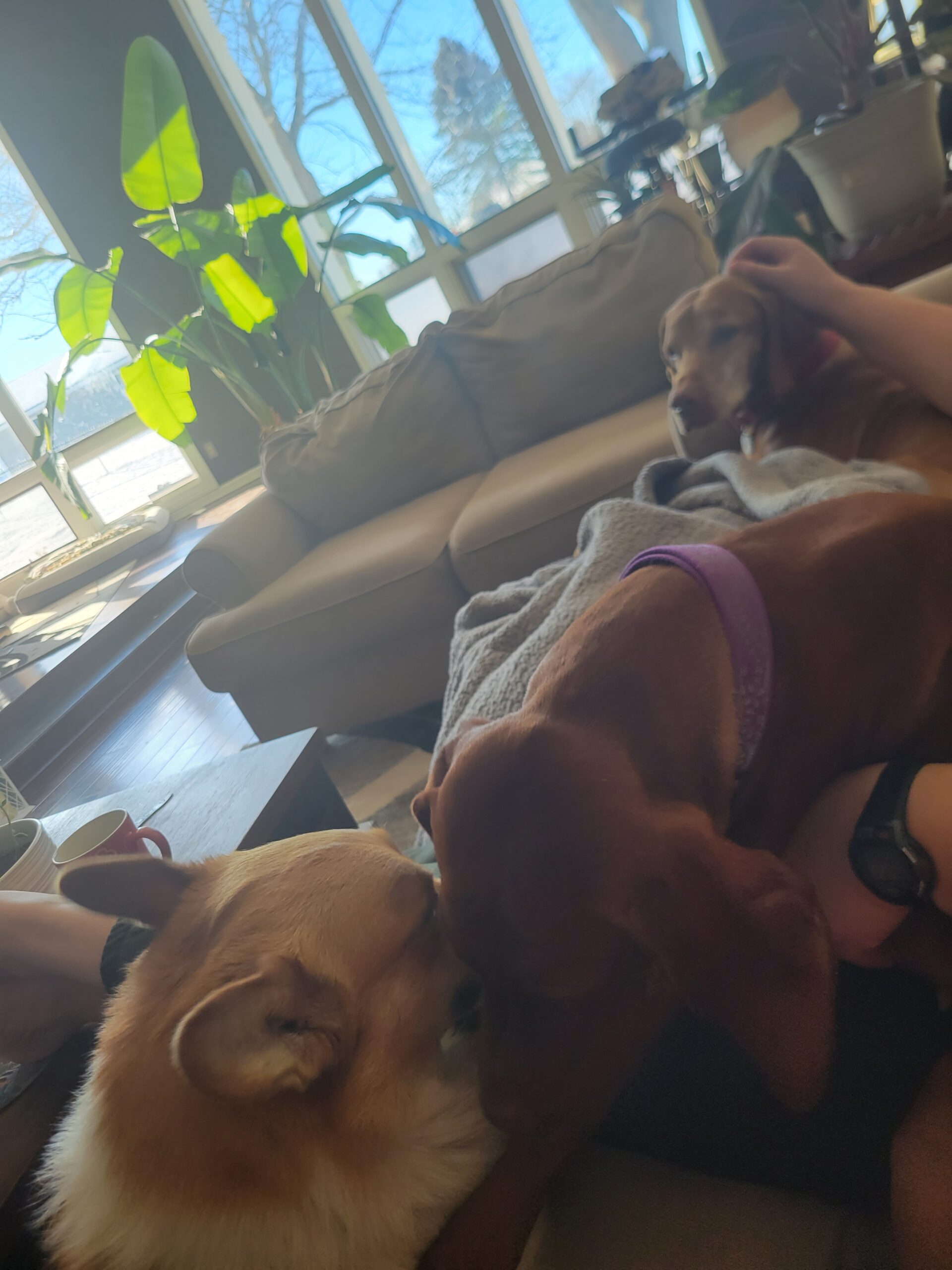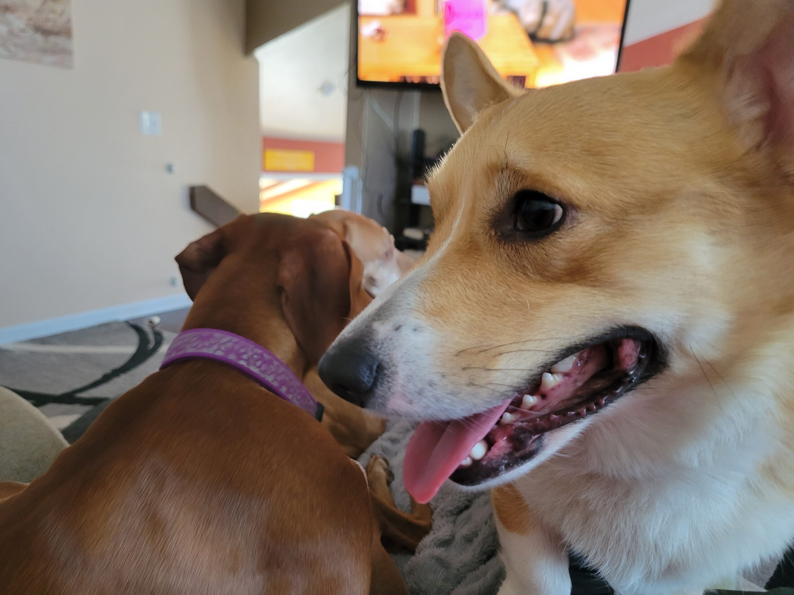 Dobby met his friend Corgi friend and Great Dane! He was tiny compared to him!