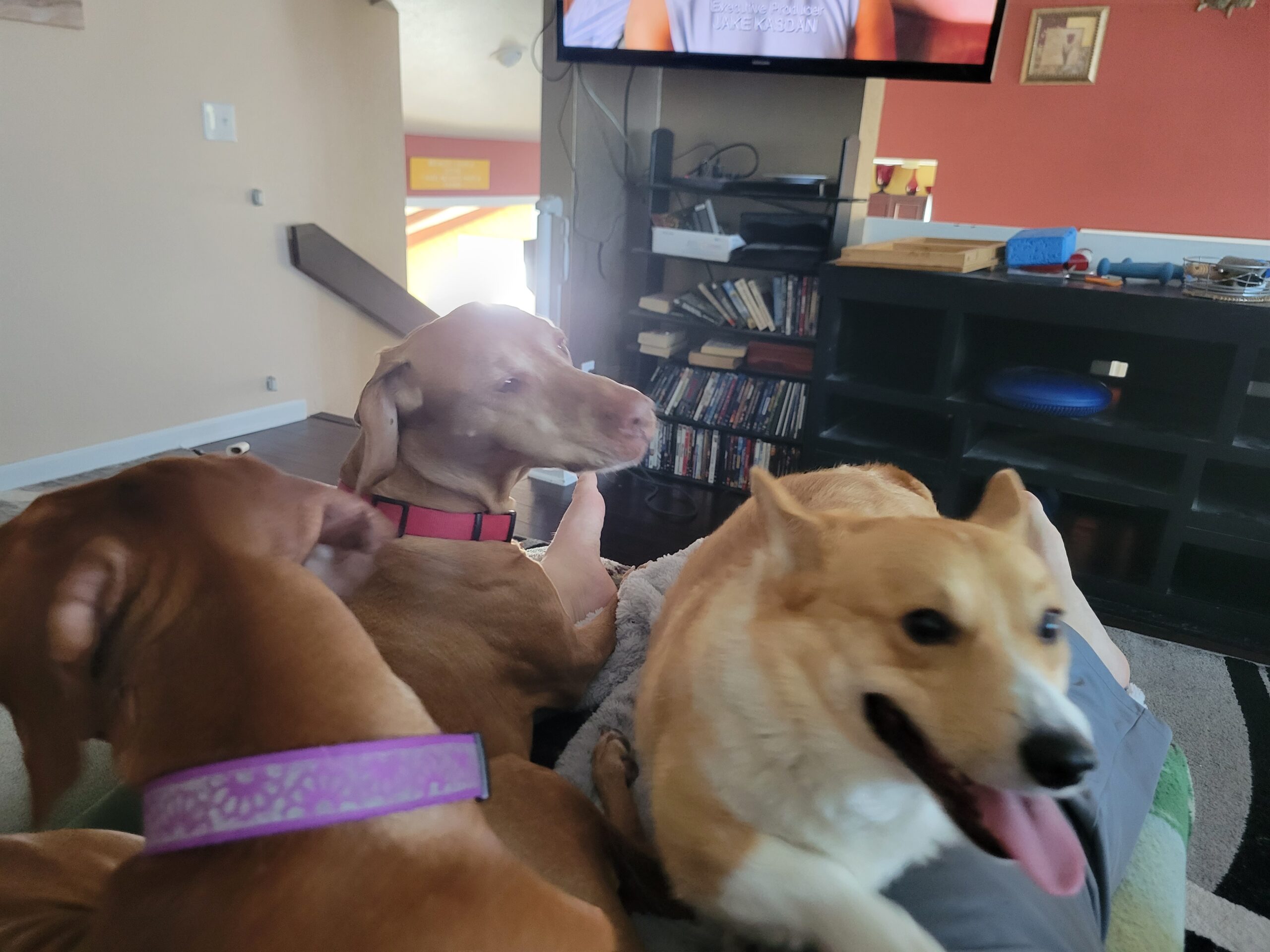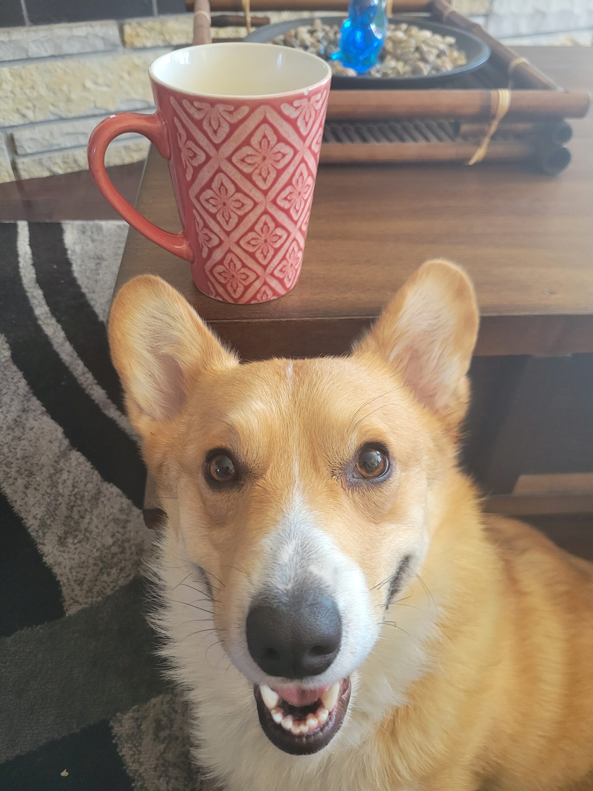 Dobby’s being so good protecting Dad’s Coffee from the other dogs πβ The one in the purple π£ collar is his girlfriend π